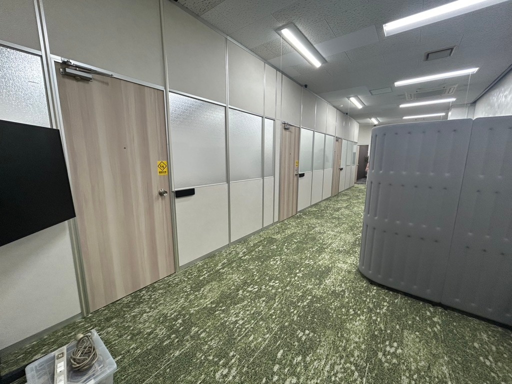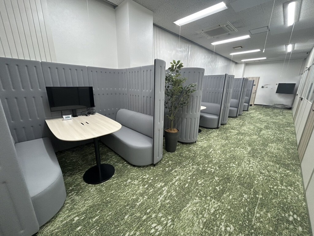 この度、某民間企業様より応対エリアや会議・ミーティングエリアの内装改修工事のご依頼を頂きました。応対エリアでは、複数の打合せ席を同一空間に設けていたことに加え、空間全体を同系統のカラーリングで統一されておりました。そこで、新しい遮音応対ブースの木目天板に合わせて、自然の要素を取り入れたグリーン系統のカーペットや木目のダイノックシートなどで仕上げました。機密的な打合せの中にも自然な安らぎの用をを取り入れることによって、ストレスフリーな応対空間を実現しました。