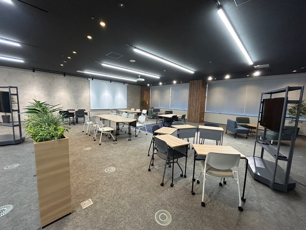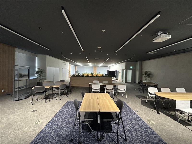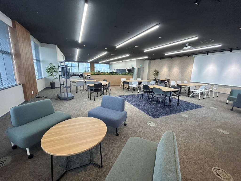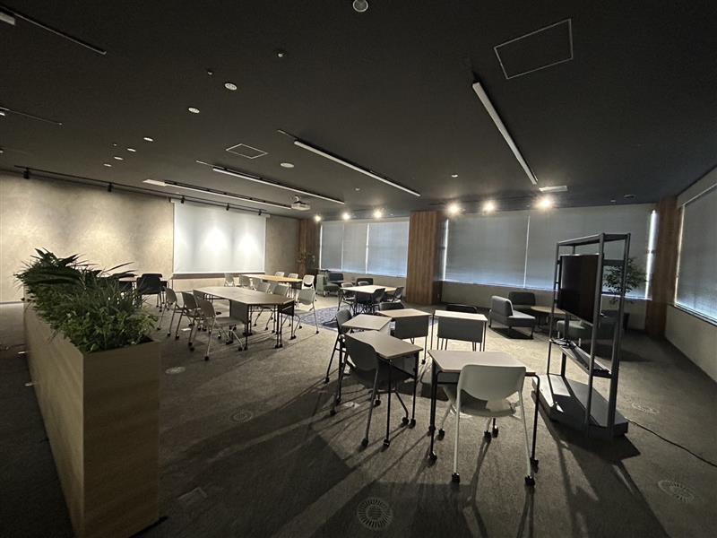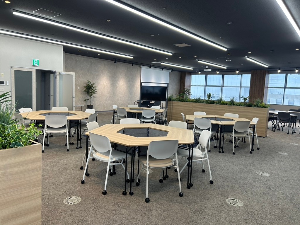従来、展望スペースとセミナー室を区切っていたエリアを開放的な空間にリニューアルした際に、電動スクリーンを設けたプロジェクター利用や組換えが自由なキャスター付きテーブル・チェアで多目的利用に適した空間とし、セミナー形式の利用やミーティング・イベントしても活用できる台形のテーブルも採用しました。カラーリングもKOBEをイメージした配色とし、家具の素材にはSDGs素材を活用した次世代の空間を実現しました。