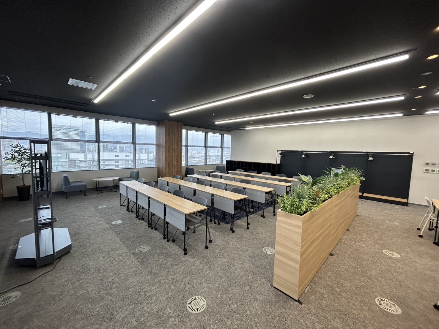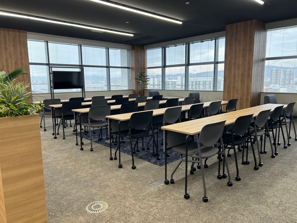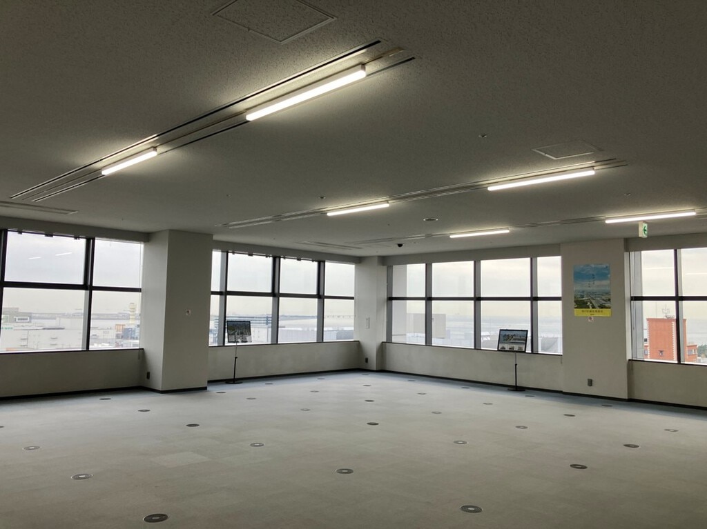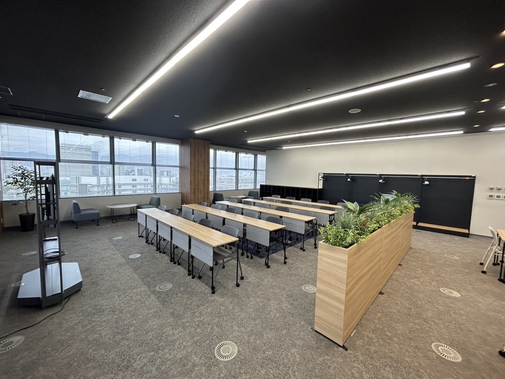従来、展望スペースとセミナー室を区切っていたエリアを開放的な空間にリニューアルした際に、電動スクリーンを設けたプロジェクター利用や組換えが自由なキャスター付きテーブル・チェアで多目的利用に適した空間とし、セミナー形式の利用やミーティング・イベントしても活用できる台形のテーブルも採用しました。カラーリングもKOBEをイメージした配色とし、家具の素材にはSDGs素材を活用した次世代の空間を実現しました。